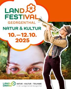 Das Landfestival findet vom 10. bis 12. Oktober 2025 an zahlreichen Orten in und um Georgenthal statt. Es ist ein außergewöhnliches Kunst- und Naturevent im Staatlich anerkannten Erholungsort Georgenthal. Im Mittelpunkt des Festivals steht die kreative und nachhaltige Verbindung von Kunst, Natur und Menschen. Die Angebote sind kostenfrei so lang die Plätze reichen.
