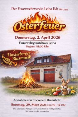 Kommt zum Osterfeuer nach Leina - Treffpunkt für Jung und Alt. Es gibt Getränke, Bratwürste und ein wärmendes Feuer.