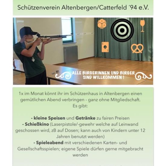 1x im Monat könnt ihr im Schützenhaus in Altenbergen einen gemütlichen Spieleabend mit verschiedenen Karten- und Gesellschaftsspielen verbringen. Eigene Spiele dürfen gerne mitgebracht werden.
