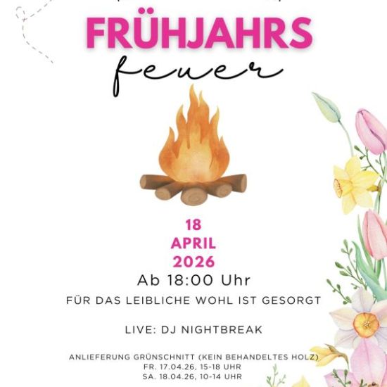 Der Feuerwehrverein Engelsbach lädt herzlich zum Frühjahrsfeuer ein. Für Speisen und Getränke ist gesorgt.