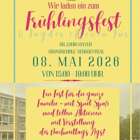 Am Freitag, den 8. Mai, lädt die Grundschule Dr. Louis Mayer in Georgenthal herzlich zum diesjährigen Frühlingsfest ein. Alle Kinder, Eltern und Interessierten aus Georgenthal und der Umgebung sind willkommen, gemeinsam einen fröhlichen Nachmittag auf dem Schulgelände zu verbringen. Das Frühlingsfest bietet gleichzeitig eine wunderbare Gelegenheit, die Schule kennenzulernen. Die verschiedenen Nachmittags- und Hobbyangebote der Schule werden vorgestellt – darunter unter anderem Rodeln, Bambini-Sport, Tanzen und weitere Aktivitäten, an denen die Kinder im Schulalltag teilnehmen können. Besonders für Familien mit zukünftigen Schulkindern ist dies eine gute Möglichkeit, einen Einblick in das Schulleben zu bekommen.