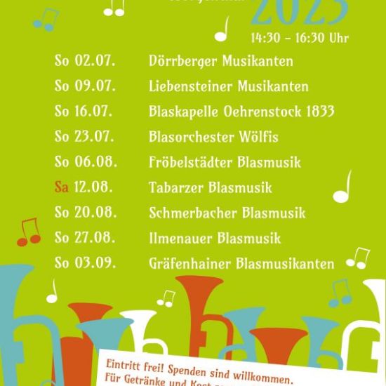 Kurparkkonzert in Georgenthal Sonntag 02.07. 2023 14:30 - 16:30 Uhr Die Dörrberger Musikanten eröffnen am 02. Juli 2023 in Georgenthal die Kurpark- Konzertsaison. Der Eintritt ist frei und Spenden sind gern willkommen. Die Georgenthaler Vereine sorgen für Getränke und Kost. Kurpark Georgenthal 99887 Georgenthal Alle Veranstaltungen Zurück alle Veranstaltungen Aktuell Navigation überspringen Nachrichten Bekanntmachungen Veranstaltungen Ticket Bestellung Termine Veranstaltungen filtern 2025 Dezember 2025 November 2025 Oktober 2025 September 2025 August 2025 Juli 2025 Juni 2025 Mai 2025 April 2025 März 2025 Februar 2025 Januar 2025 2024 Dezember 2024 November 2024 Oktober 2024 September 2024 August 2024 Juli 2024 Juni 2024 Mai 2024 April 2024 März 2024 Februar 2024 Januar 2024 2023 Dezember 2023 November 2023 Oktober 2023 September 2023 August 2023 Juli 2023 Juni 2023 Mai 2023 April 2023 März 2023 Februar 2023 2022 November 2022 Oktober 2022 September 2022 2021 Oktober 2021 September 2021 August 2021 Juli 2021 2020 Dezember 2020 November 2020 Oktober 2020 September 2020 August 2020 Juli 2020 Juni 2020 Mai 2020 April 2020 März 2020 Februar 2020