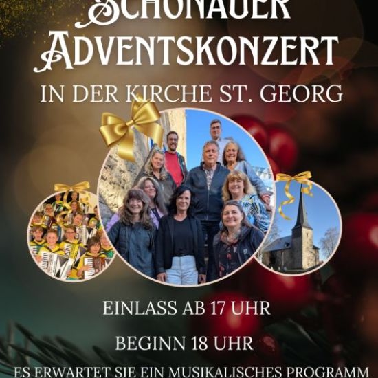 Schönauer Adventskonzert Mittwoch 10.12. 2025 18:00 Uhr Es erwartet Sie ein musikalisches Programm von Kindern der Musikschule Fröhlich und dem Chor „Zeitlos". Ein Imbiss und Getränke stehen vor der Veranstaltung bereit. Kirche St. Georg 99887 Georgenthal OT Schönau v.d.W. Alle Veranstaltungen Zurück alle Veranstaltungen Aktuell Navigation überspringen Nachrichten Bekanntmachungen Veranstaltungen Ticket Bestellung Termine Veranstaltungen filtern 2025 Dezember 2025 November 2025 Oktober 2025 September 2025 August 2025 Juli 2025 Juni 2025 Mai 2025 April 2025 März 2025 Februar 2025 Januar 2025 2024 Dezember 2024 November 2024 Oktober 2024 September 2024 August 2024 Juli 2024 Juni 2024 Mai 2024 April 2024 März 2024 Februar 2024 Januar 2024 2023 Dezember 2023 November 2023 Oktober 2023 September 2023 August 2023 Juli 2023 Juni 2023 Mai 2023 April 2023 März 2023 Februar 2023 2022 November 2022 Oktober 2022 September 2022 2021 Oktober 2021 September 2021 August 2021 Juli 2021 2020 Dezember 2020 November 2020 Oktober 2020 September 2020 August 2020 Juli 2020 Juni 2020 Mai 2020 April 2020 März 2020 Februar 2020