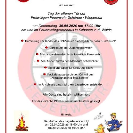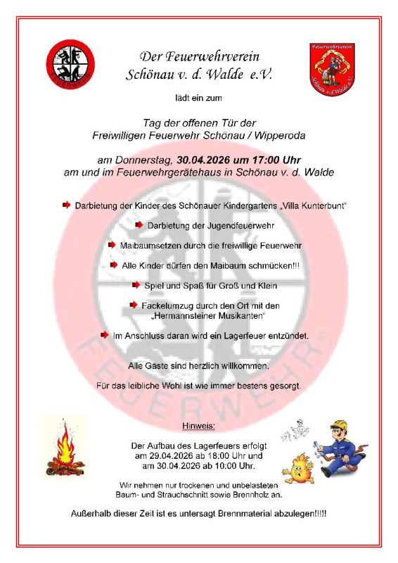 Der Feuerwehrverein Schönau v. d. Walde e.V. lädt am 30.04.26 zum Tag der offenen Tür ein.