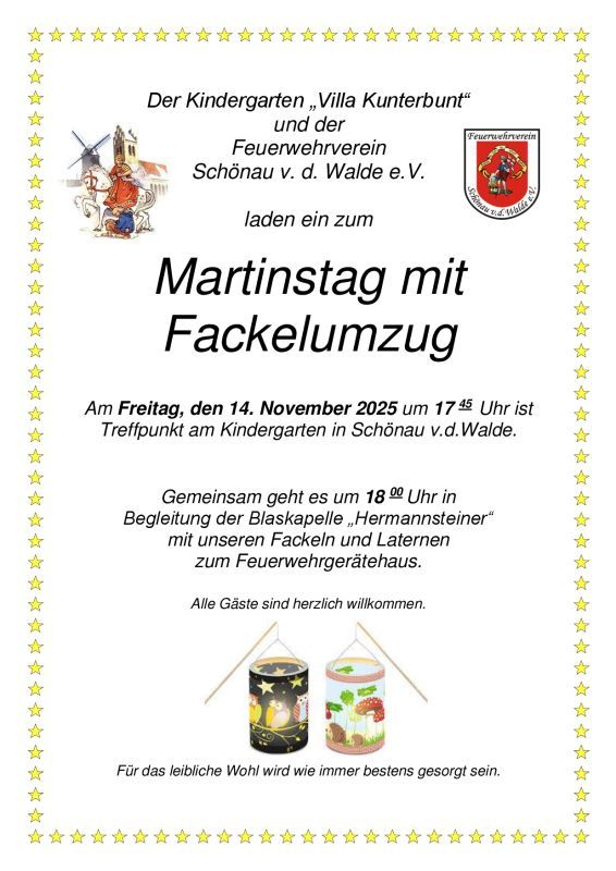 Der Kindergarten „Villa Kunterbunt“ und der Feuerwehrverein Schönau v. d. Walde e.V. laden ein zum Martinstag mit Fackelumzug.